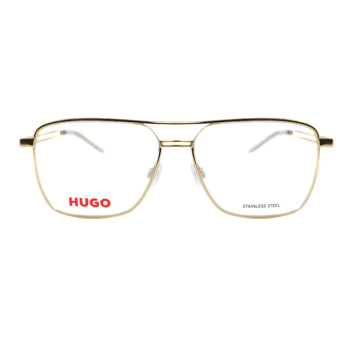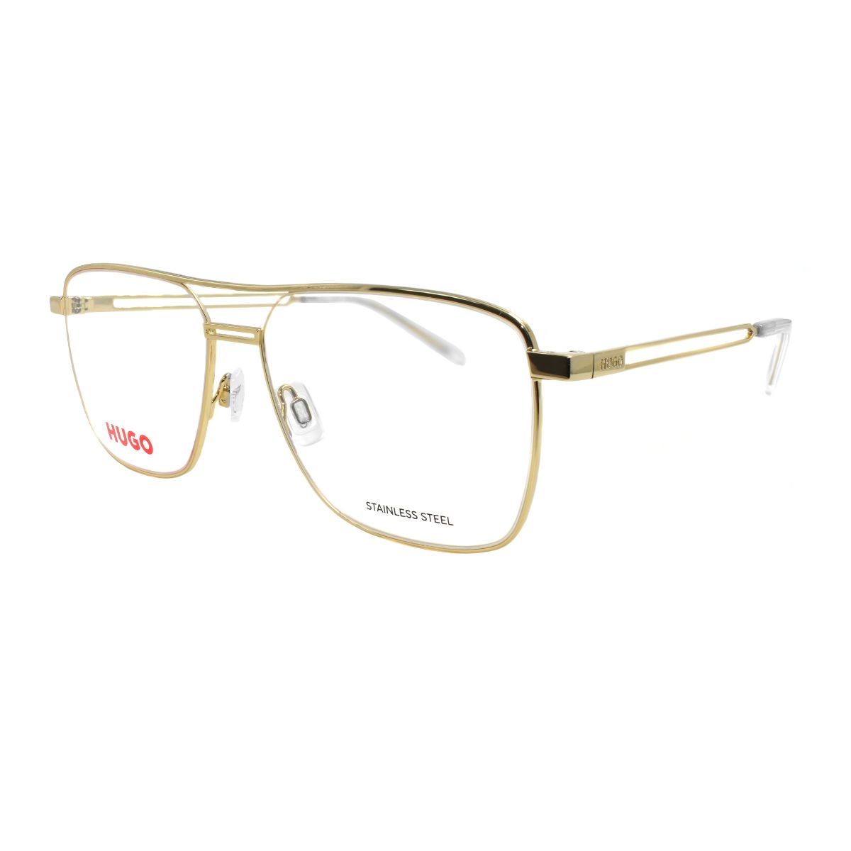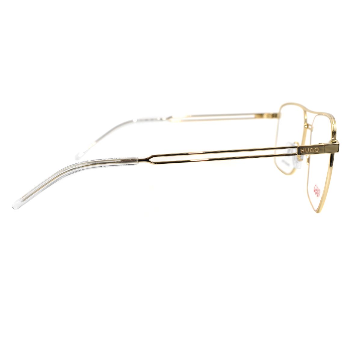 Armazón oftálmico de la marca Hugo, con varillas de metal c/ acetato y marco de metal.
