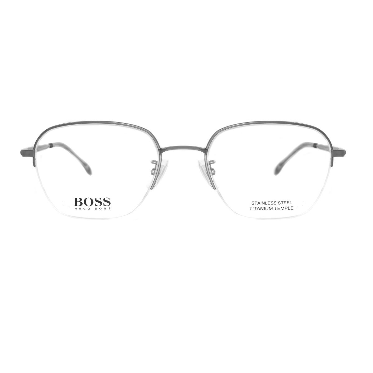 Armazón oftálmico de la marca Boss, con varillas de acero inoxidable y marco de titanio.
