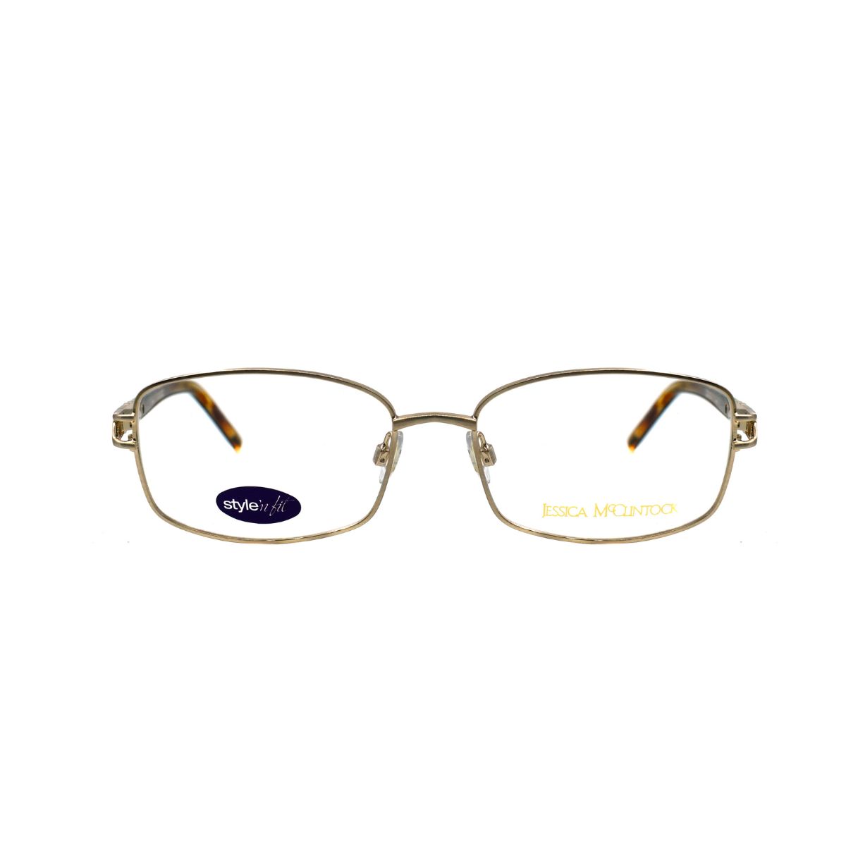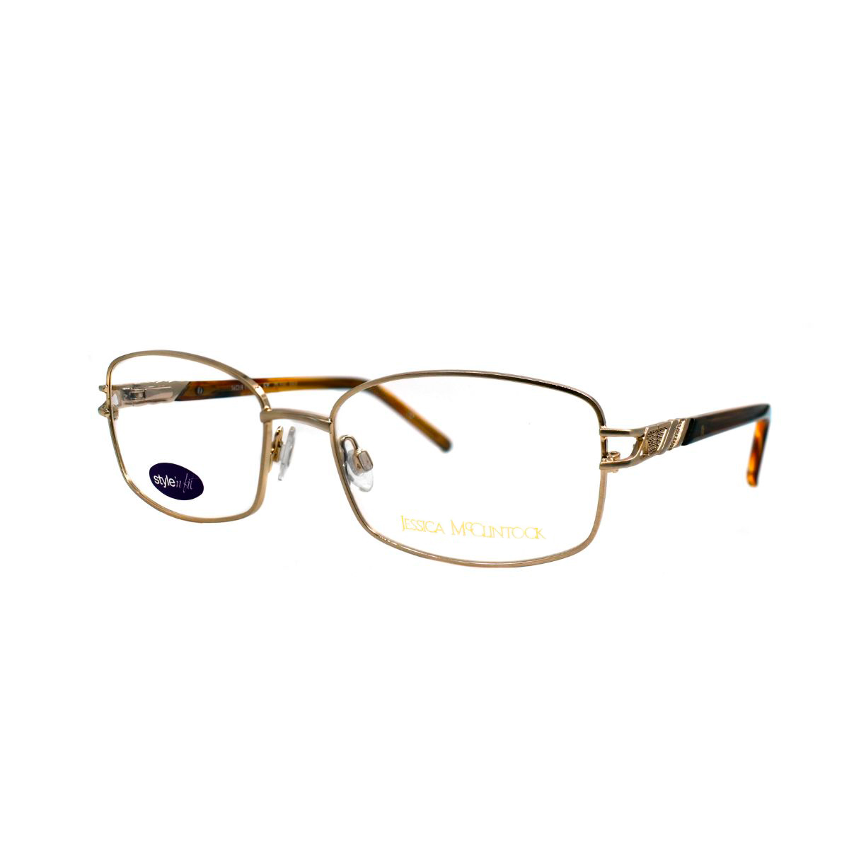 Armazón oftálmico de la marca Jessica McClintock, con varillas de aleación metálica / acetato y marco de aleación metálica.