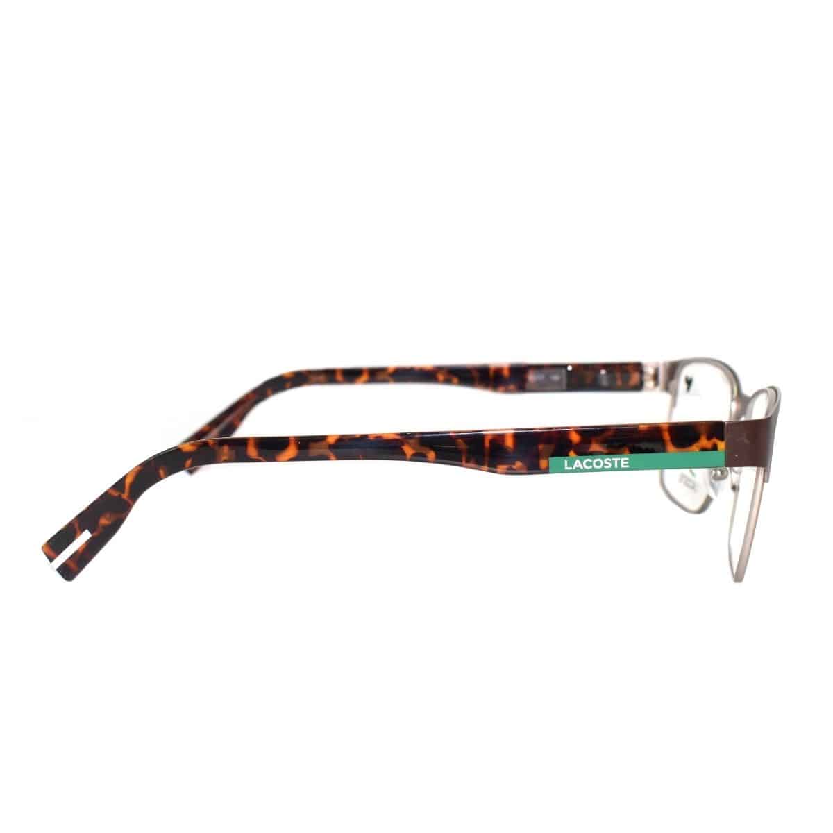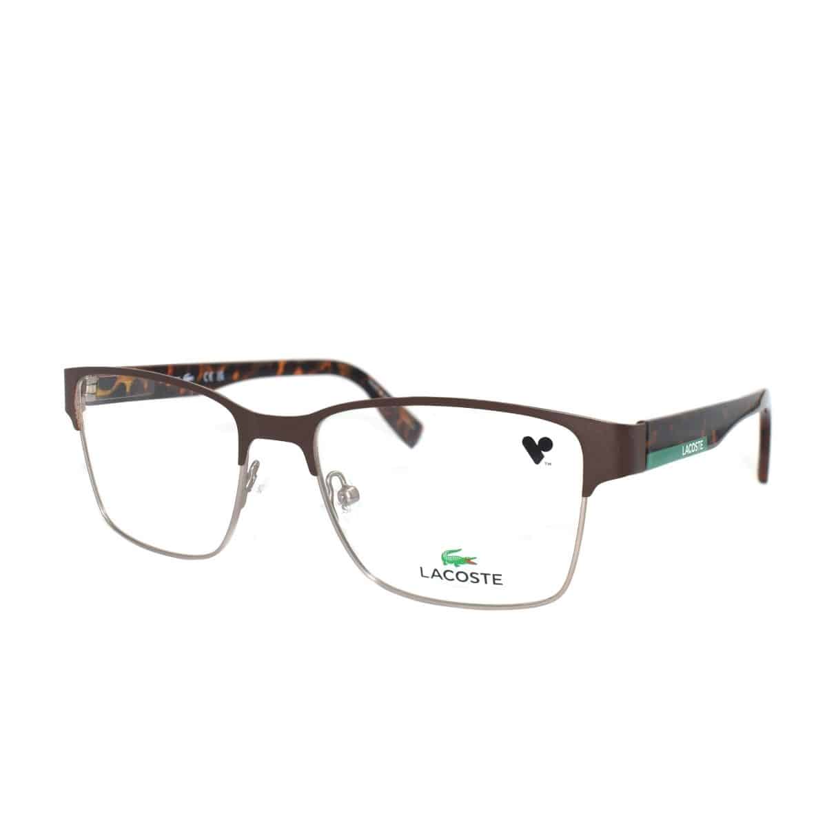 Armazón oftálmico de la marca Lacoste, con varillas de acetato y marco de metal.